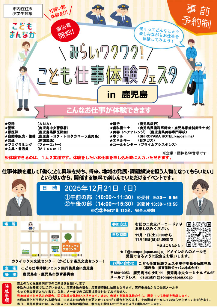 お知らせ NEWS HOME お知らせ みらいワクワク!こども仕事体験フェスタin鹿児島のお知らせ みらいワクワク!こども仕事体験フェスタin鹿児島のお知らせ 2025.11.04 2025年12月21日(日)に開催されるイベントのご案内です。 このイベントへはMisumiも参加いたします! この機会にぜひご参加ください! 申込期間:2025年11月1日(土)~11月16日(日) ※事前予約制